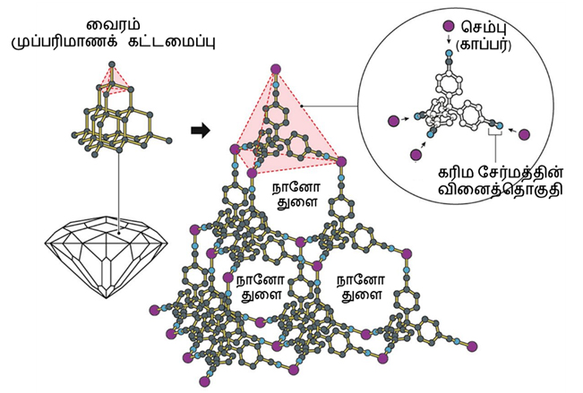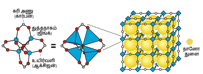 உங்கள் பகுதியில் புதிதாக உருவாகும் ஒரு பல்லடுக்குக் கட்டிடத்தைப் பாருங்கள். உடம்புக்கு எலும்புகள் எவ்வாறு வடிவத்தை வழங்குகின்றனவோ அதைப்போலவே கட்டிடத்திற்கும் தூண்கள் எனப்படும் சட்டங்கள், கீழிருந்து மேலாகவும், அவற்றின்மேல் இடவலமாகவும் அமைக்கப்படுகின்றன. உள்ளே கட்டப்படும் அறைகளின் பரப்பு, தூண்களின் இடைவெளிகளைப் பொறுத்துத் தீர்மானிக்கப்படுகின்றது. இதை வேறு வழியில் சொல்வதென்றால், மனிதர்கள் தங்களுக்குத் தேவையான அளவுள்ள அறைகளைத் தொழில்நுட்பத்தின் மூலம் உருவாக்கிக்கொள்ள முடியும். ஆனால் கண்ணுக்குத் தெரியாத நுண்ணறைகளை? உதாரணமாக நம் மயிரிழையின் விட்டத்தில் அல்லது உடம்பிலிருந்து வியர்வை வெளியேறும் துளைகளின் சுற்றளவில் பல்லாயிரத்தில் ஒரு பங்கு அளவுள்ள அறைகளை உருவாக்க முடியுமா? கிட்டத்தட்ட 36 வருடங்களுக்கு முன்பு அந்தச் சாதனையை மெல்பேர்ன் பல்கலைக்கழகப் பேராசிரியர் ரிச்சர்ட் ராப்சன் கரிமச் சேர்மங்களையும் உலோக அணுக்களையும் வைத்து நிகழ்த்திக் காட்டினார். வேதியியலின் புதிய துறையொன்று உருவாக அடிக்கல் நாட்டினார். நுண்துளைகளால் ஆன, உலோக-கரிமக் கட்டமைப்பு (Metal-Organic Framework) உருவானது; உலகம் அதுவரை கண்டிராத அறைகள் திறந்தன. அதாவது வியர்வை வெளியேறும் துளைகளின் விட்டம் ஐம்பதாயிரம் நானோமீட்டர்கள் என்றால், இந்த நுண்துளைப் பொருள்களின் விட்டம் சில நானோமீட்டர்கள்.